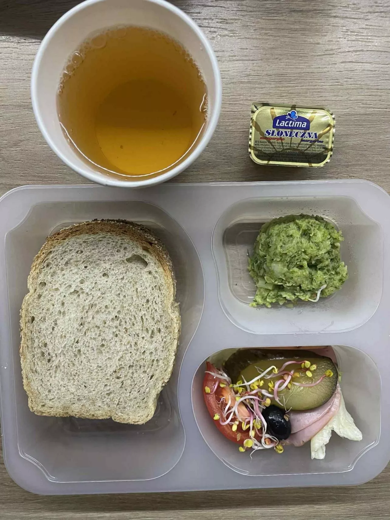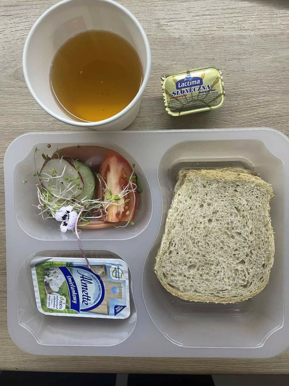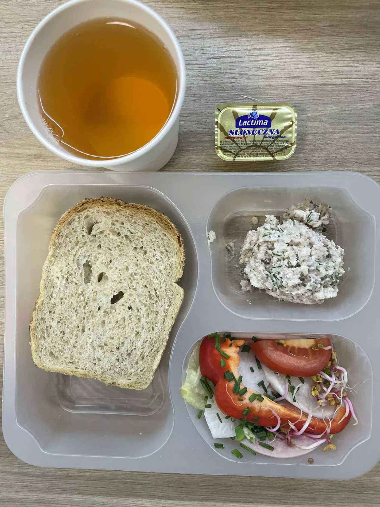 Śniadanie: dieta podstawowa (Chorzów, Sosnowiec) Zupa mleczna z płatkami owsianymi – kawa zbożowa – chleb śląski – kajzerka – margaryna – pasta serowa ze szczypiorkiem – szynkowa dębowa – pomidor – sałata – ogórek – kiełki A: GLU, MLE