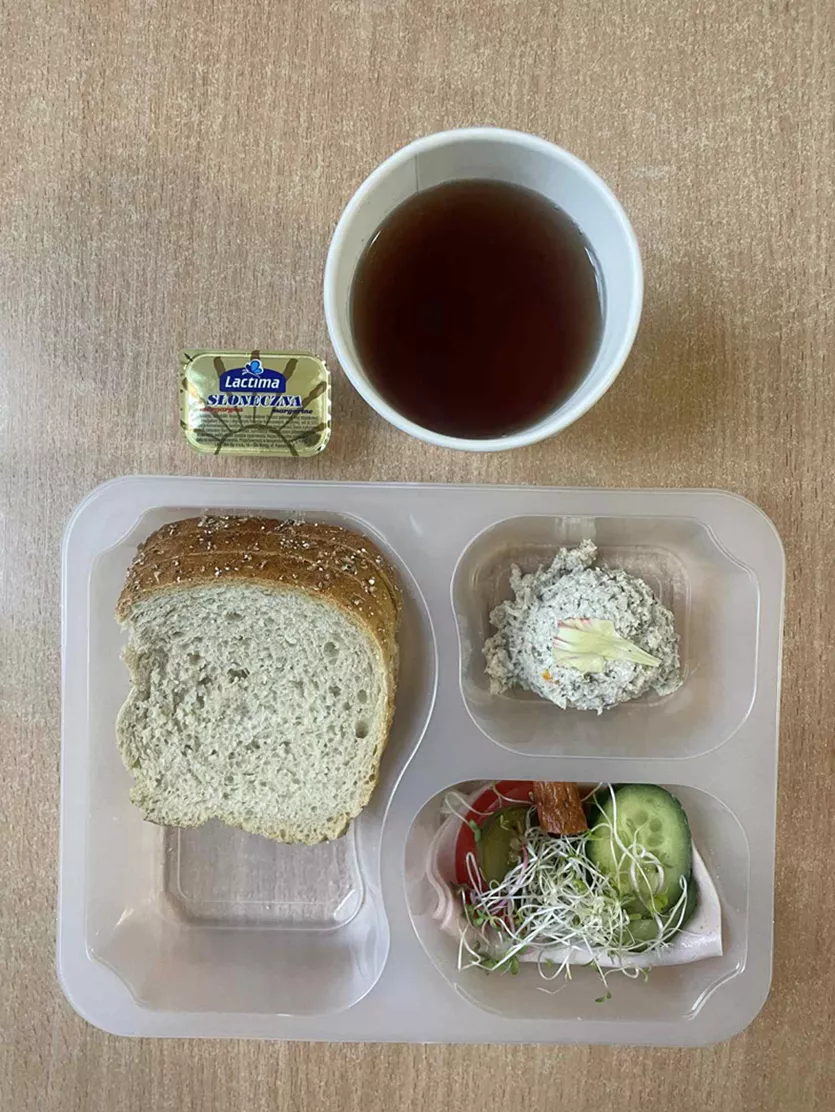 Śniadanie: dieta z ograniczeniem łatwoprzyswajalnych węglowodanów (Chorzów, Sosnowiec) kawa zbożowa - chleb graham – margaryna - pasta z twarogu z ogórkiem zielonym – łopatka konserwowa – pomidor – sałata – ogórek – ogórek kiszony – rzodkiewka – kiełki – kiwi A: GLU, SOJ, MLE, SEL, GOR