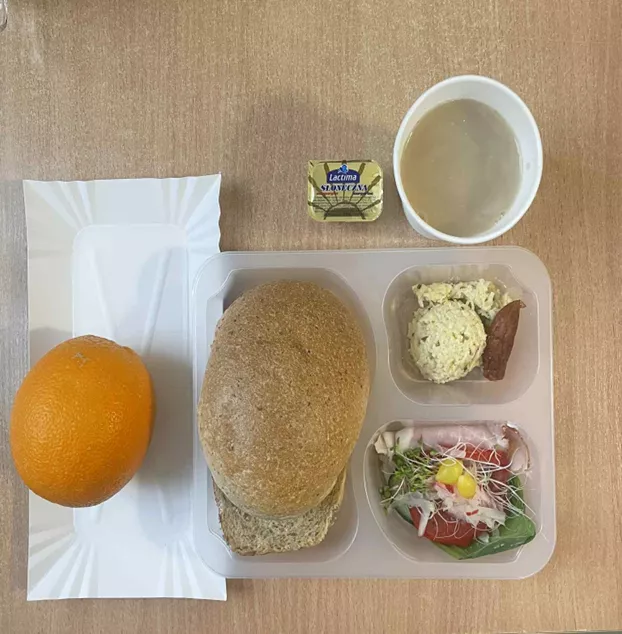 Śniadanie: dieta z ograniczeniem łatwoprzyswajalnych węglowodanów (Chorzów, Sosnowiec) kawa zbożowa - chleb graham – margaryna - pasta jajeczna z koperkiem – polędwica sopocka – pomidor – sałata – sałata – kiełki – oliwki – mandarynki A: GLU, JAJ, SOJ, MLE, SEL, GOR