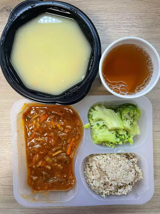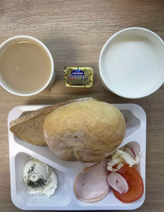 Śniadanie: dieta podstawowa (Chorzów, Sosnowiec) Zupa mleczna z brązowym ryżem – kawa zbożowa – chleb śląski – kajzerka – margaryna – jaja gotowane – łopatka konserwowa – ogórek – sałata – pomidor – kiełki – rzodkiewka A: GLU, JAJ, SOJ, MLE, SEL, GOR