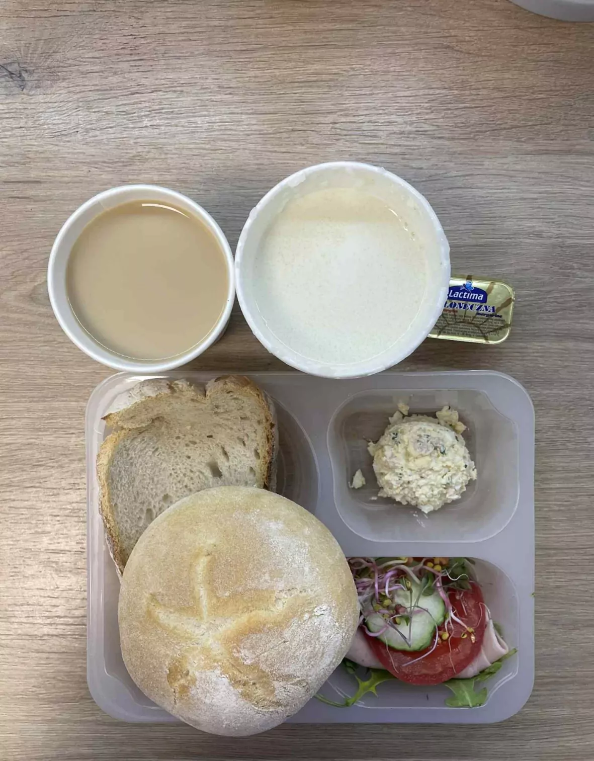 Śniadanie: dieta podstawowa (Chorzów, Sosnowiec) Zupa mleczna z kaszą orkiszową – kawa zbożowa – chleb śląski – kajzerka – margaryna – pasta jajeczna z koperkiem – szynka rzeźnika – pomidor – sałata – kiełki – ogórek A: GLU, JAJ, SOJ, MLE, SEL, GOR