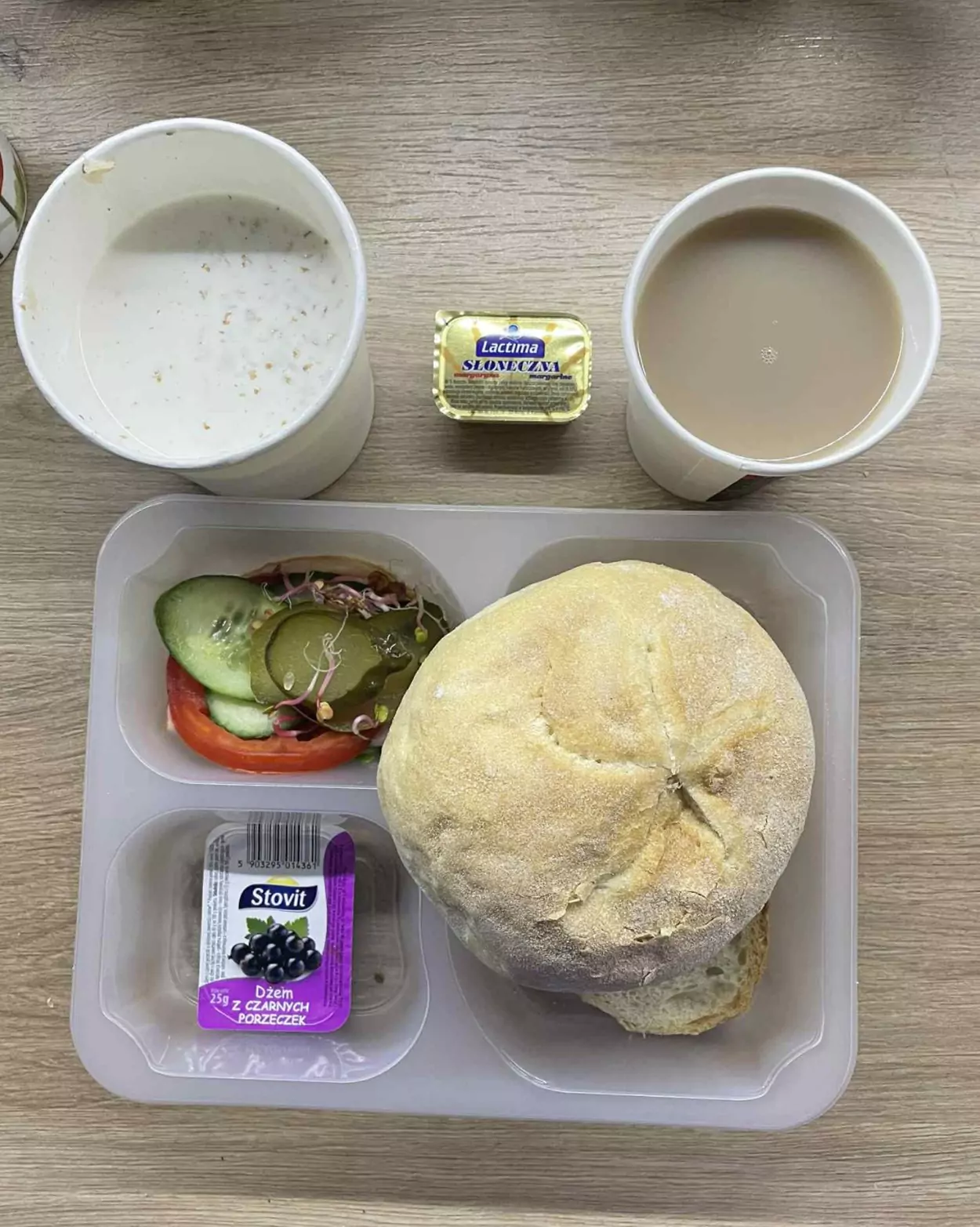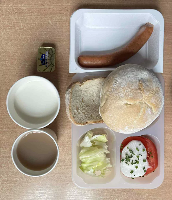 Śniadanie: dieta podstawowa (Chorzów, Sosnowiec) Zupa mleczna z płatkami owsianymi – kawa zbożowa – chleb śląski – kajzerka – parówki z szynki – szynka biała – ogórek – sałata – rzepa – pomidor – szczypiorek A: GLU, SOJ, MLE, SEL, GOR